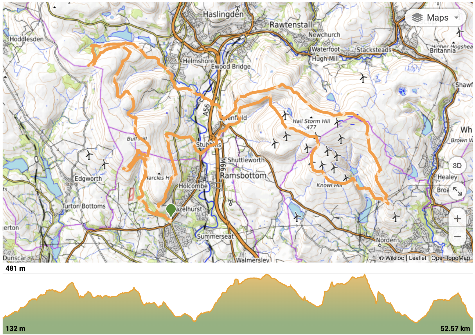 Designed to showcase the area’s beautiful trails, climbs, and descents, the route links Holcombe Moor and Scout Moor. It includes six trig points, two cairns, two crosses, a chimney, and a tower—highlighting some of the region’s finest fell running terrain.